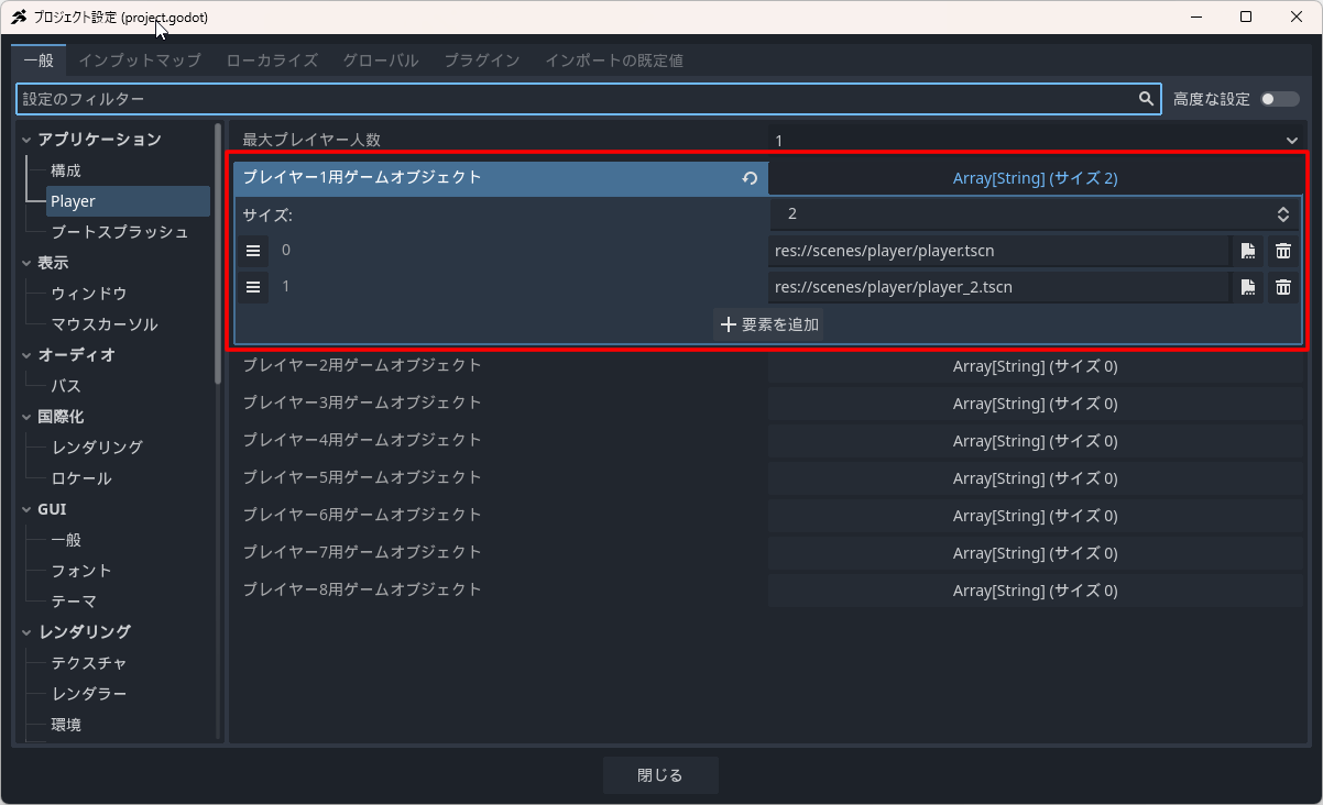 ■プロジェクト→Playerの「プレイヤー1用ゲームオブジェクト」でPlayerシーンを設定する
