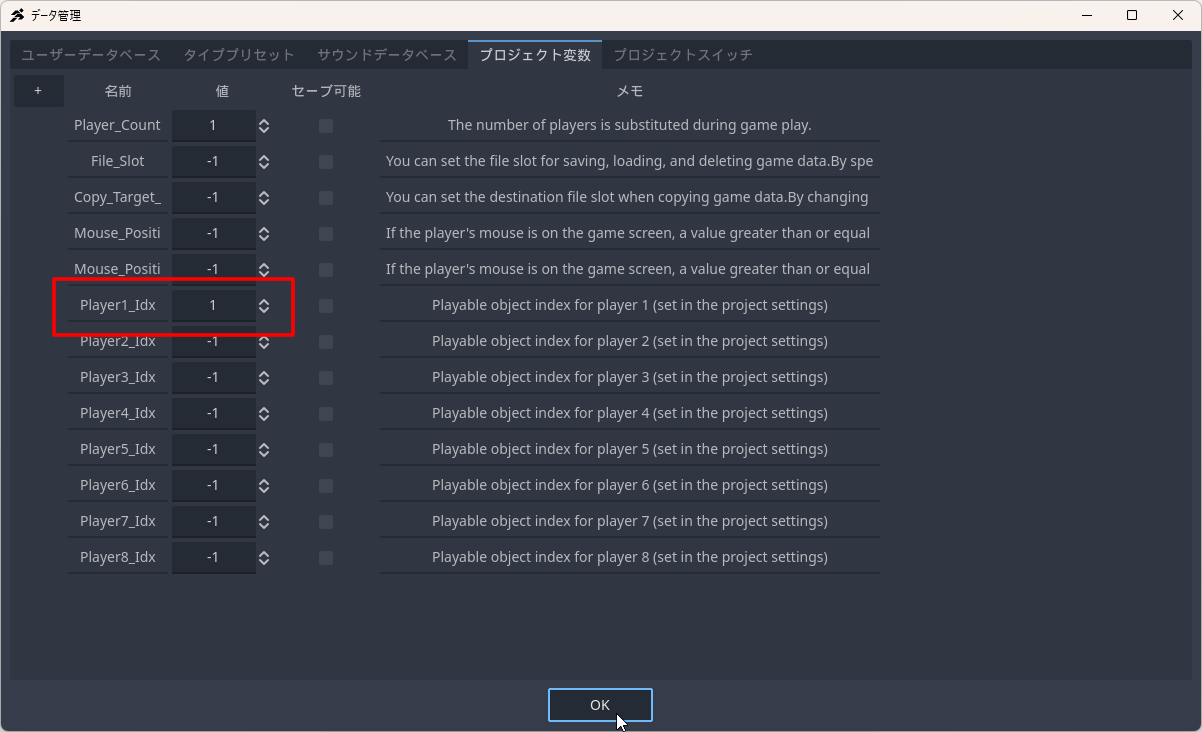 ■データベース→プロジェクト変数の「Player1_Idx」で値を設定する
