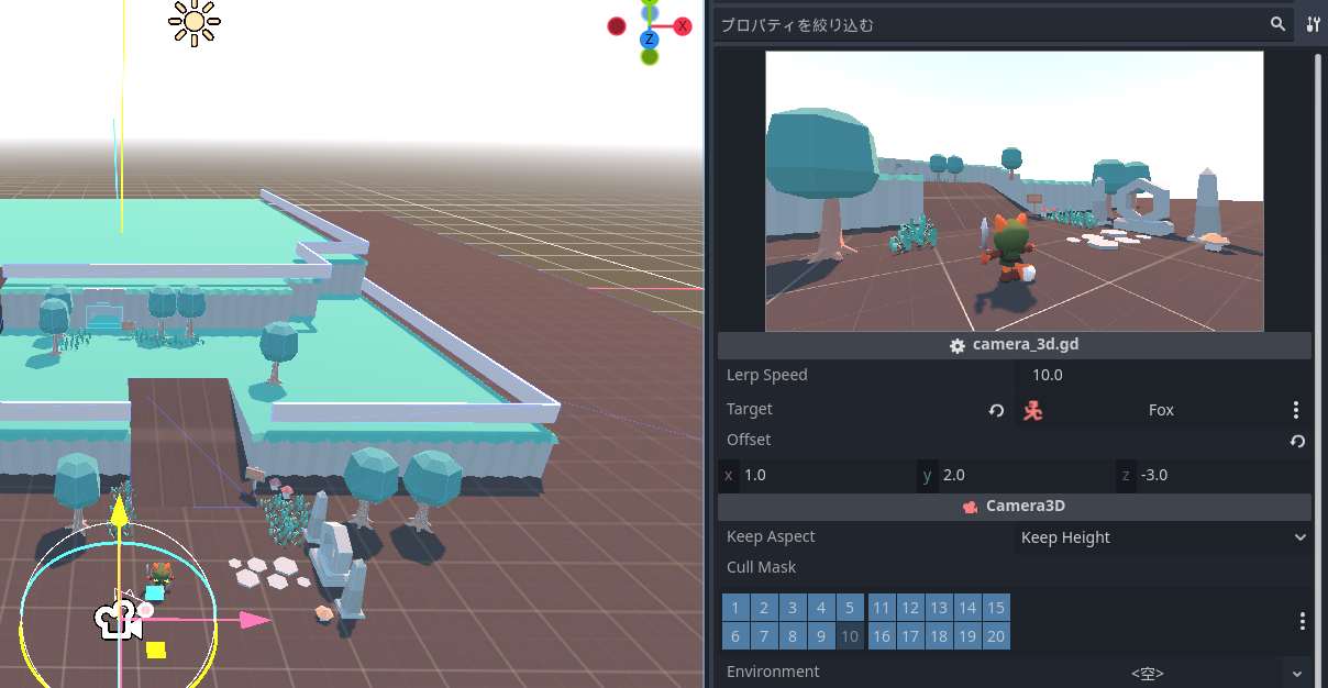 カメラに映らないようにする 4か月 ago morino555 1 minute カメラの「Cull Mask」で映したくない番号を外す。(No.10)今回の場合だと周りに設定してある壁(CSG) 壁(CSG)を初期の1から10に変更する エディタ上は表示されていても実行すると映らなくなる